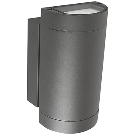 Arbotante LED de pared para exterior/interior, con una potencia de 14.5 Watts. Emite luz cálida (3000K) y funciona con un voltaje universal de 100-240V. Acabado en color gris.
