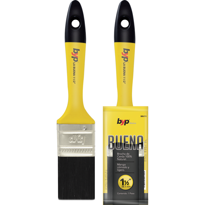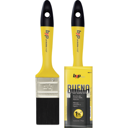 Brocha de la línea La Buena, diseñada para trabajos de precisión y áreas de tamaño medio. Con un ancho de 1 1/2 pulgadas, es versátil para molduras, marcos o detalles. Ofrece un corte recto que garantiza un acabado liso.