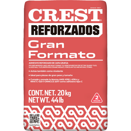 Adhesivo (pegazulejo) de la marca Crest, especialmente formulado para la instalación de pisos de gran formato. Presentación en saco de 20 kg y color blanco.