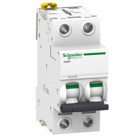 Interruptor termomagnético de alta calidad con 2 polos y capacidad de 32 amperes, diseñado para proteger los circuitos eléctricos contra sobrecargas y cortocircuitos.