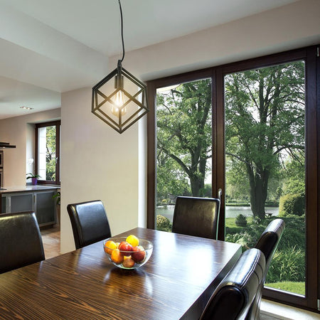 Estilo industrial con la lámpara colgante Cubic Merak negra. Base E27, diseño geométrico en acero que transforma cualquier espacio moderno.