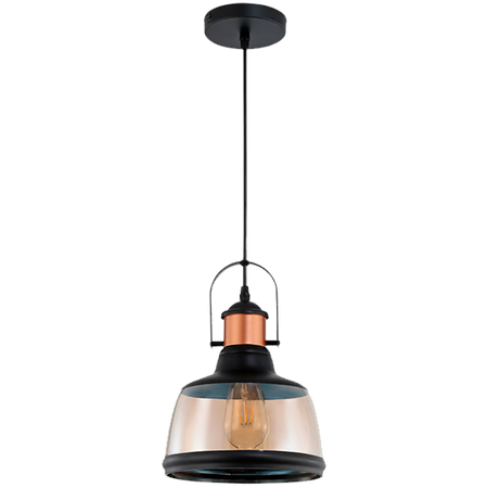 Lámpara colgante para interiores, estilo decorativo, pantalla de cristal con efecto al encender, acabado negro/dorado, base E27, compatible con focos estilo vintage y atenuadores. Cable ajustable oculto en el canope. No incluye foco. [www.grupoedmar.mx], [tecnolite.mx]