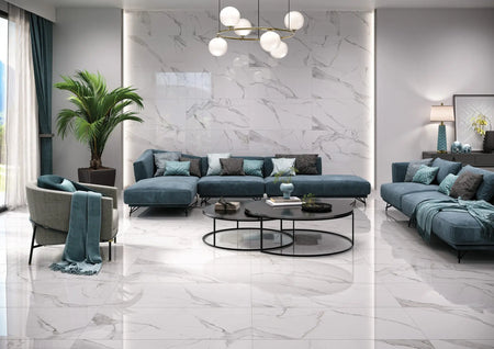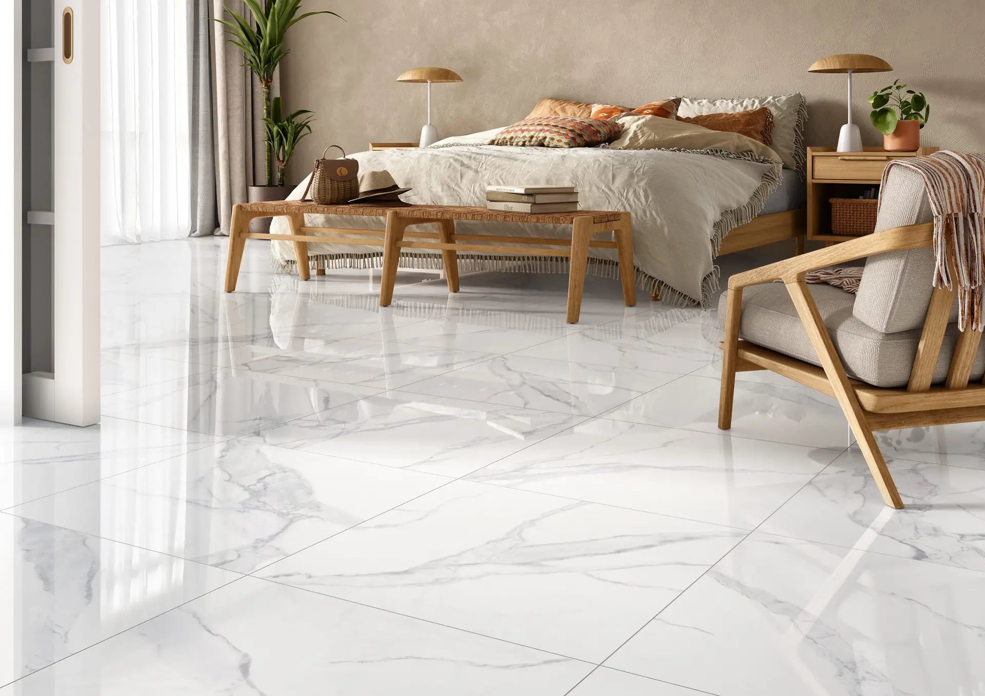 Recubrimiento de gran formato con acabado suave al tacto y apariencia de piedra blanca pulida. Elegancia minimalista con la resistencia del porcelánico.