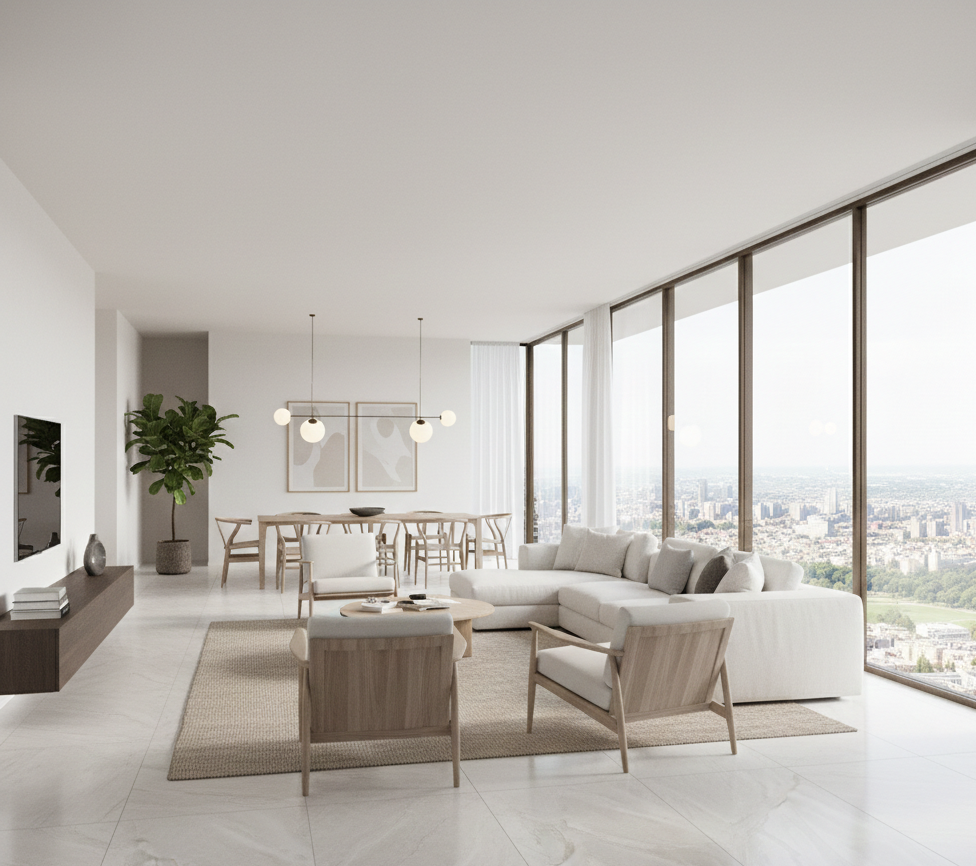 Piso con acabado brillante que resalta los matices del gris piedra. Su superficie pulida añade un toque de lujo y amplitud visual a estancias principales.