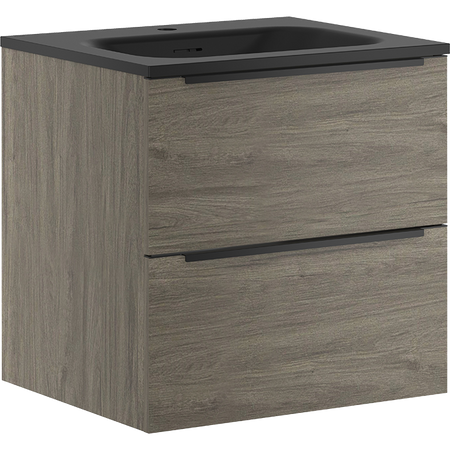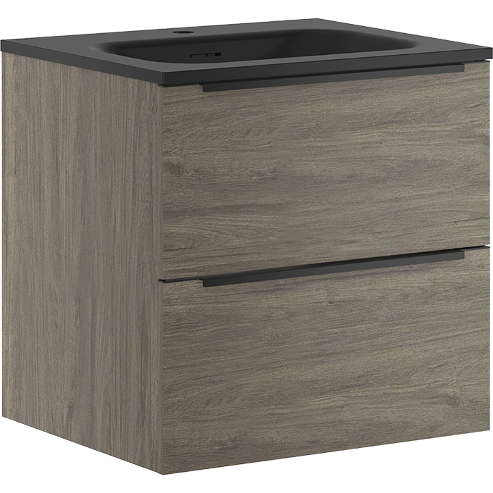 Una combinación audaz y moderna de texturas. El gabinete presenta un acabado texturizado en gris roble que aporta calidez visual y un toque rústico-urbano, contrastando perfectamente con el lavabo en negro mate. Es una pieza de mobiliario resistente a la humedad, diseñada para ser duradera y convertirse en el elemento central de cualquier baño contemporáneo.