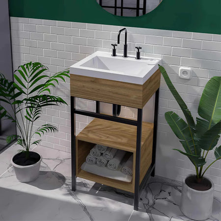 Añade un toque industrial y elegante a tu baño con el Vanity Milán de Bochetti. Con dimensiones de 48x43 cm, estructura de herrería, acabado en melamina color gales, y un lavamanos en marmolina Oslo blanco, este mueble es perfecto para combinar estilo y funcionalidad en espacios modernos.
