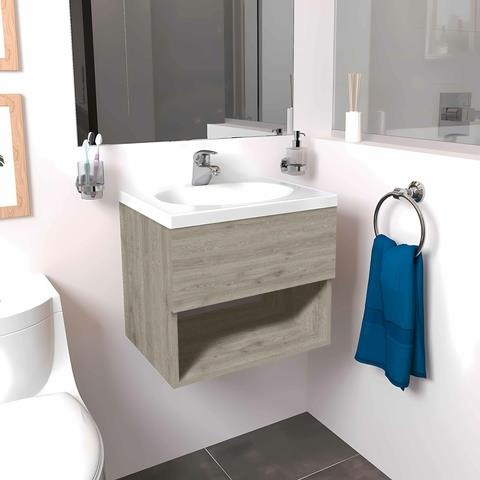 Dale un toque moderno y funcional a tu baño con el Vanity Trento de Bochetti. Con dimensiones de 48x38x40 cm, acabado en melamina color ceniza y un lavamanos en marmolina eco blanco, este mueble es perfecto para optimizar espacios pequeños con estilo y eficiencia.
